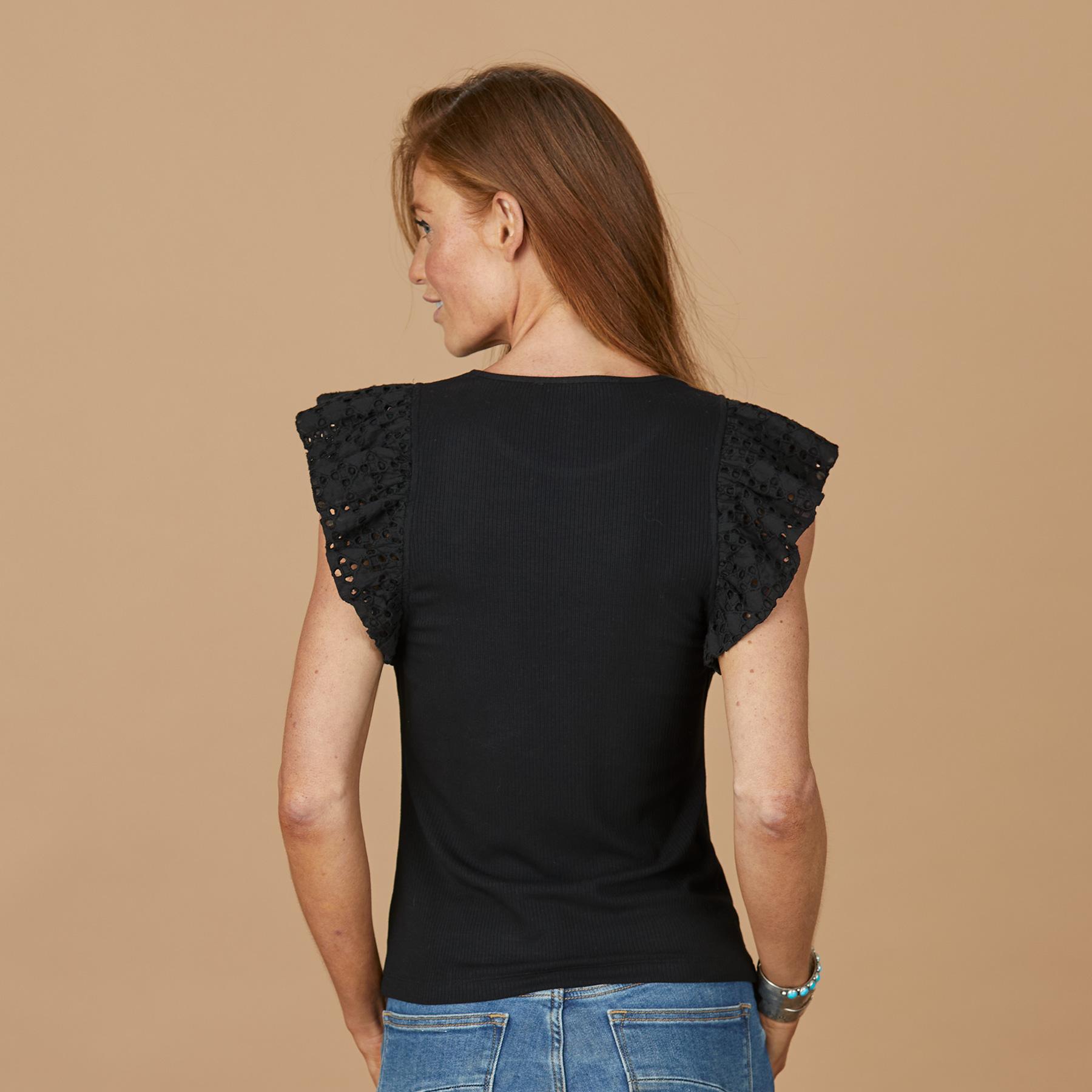 The most feminine rib knit top flatters so with eyelet flutter sleeves. Slim fit with great stretch. Rayon/spandex. Hand wash. Imported. Sundance exclusive. Sizes XS (0–2). S (4–6). M (8–10). L (12–14). XL (16–18). XXL (20–22). Approx. 23l.