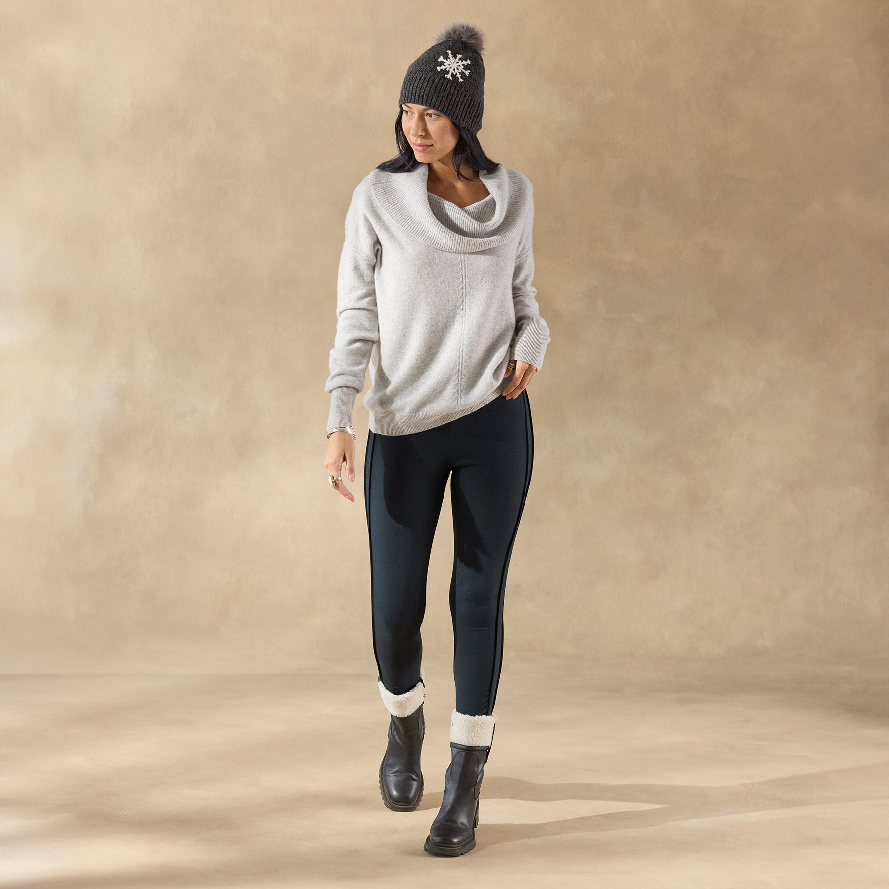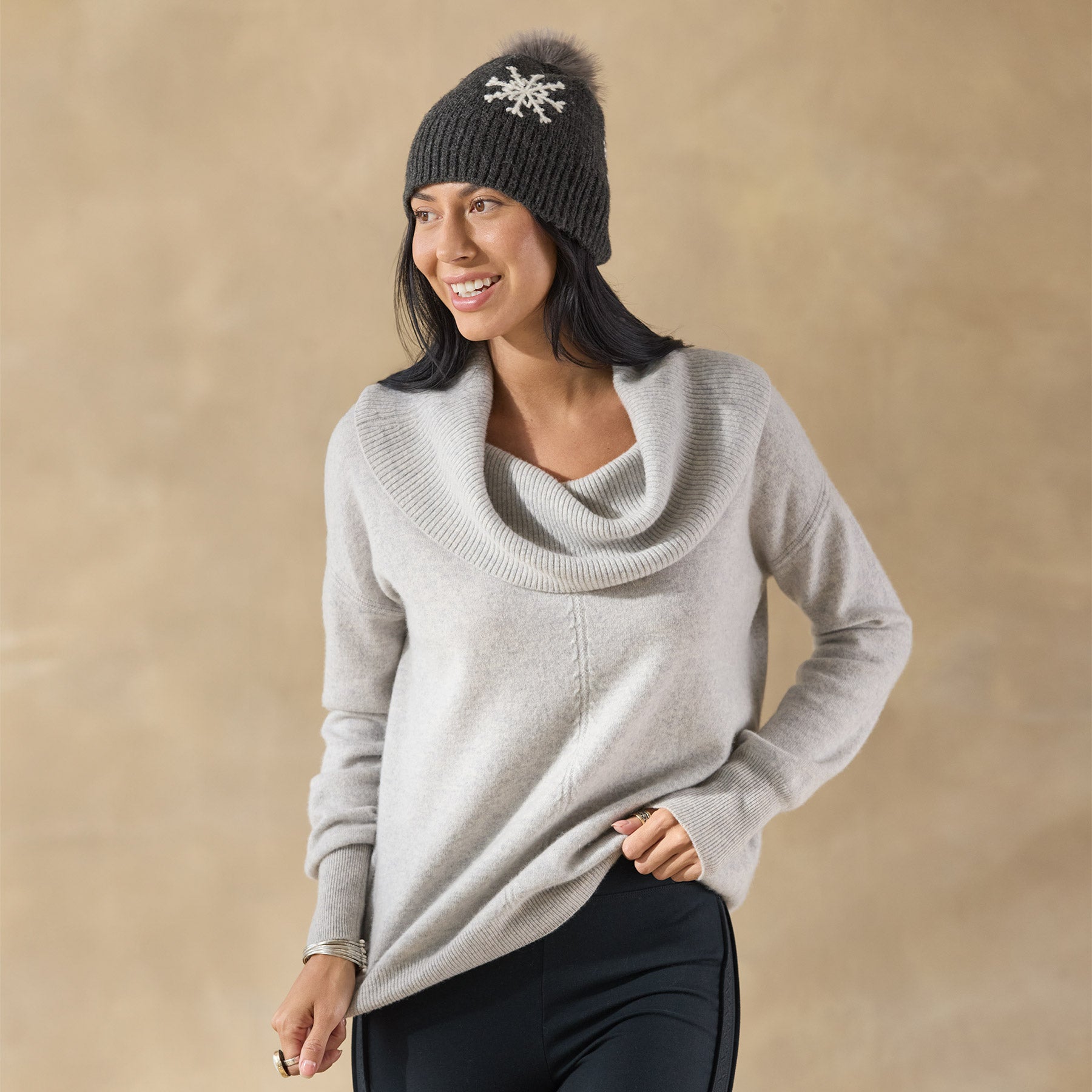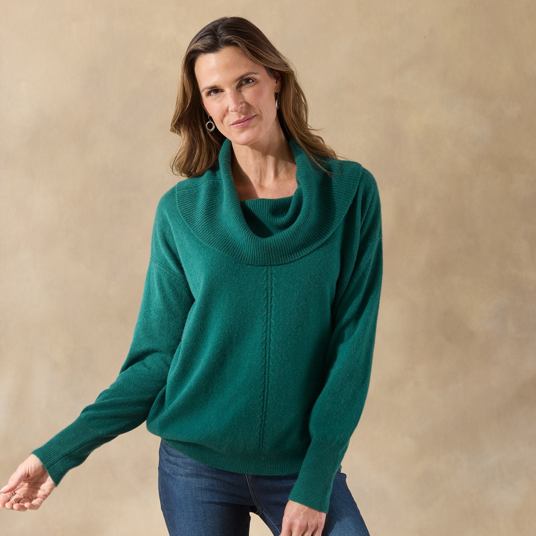 The coziest cowlneck sweater in lofty cashmere. with a ribbed cowl and sleeves. cable stitch detail at center front and back. and rib transfer details at armholes. Easy fit. Hand wash. Imported. Exclusive. Sizes XS (0??). S (4??). M (8??0). L (12??4). XL (16??8). XXL (20??2). Approx. 24l.