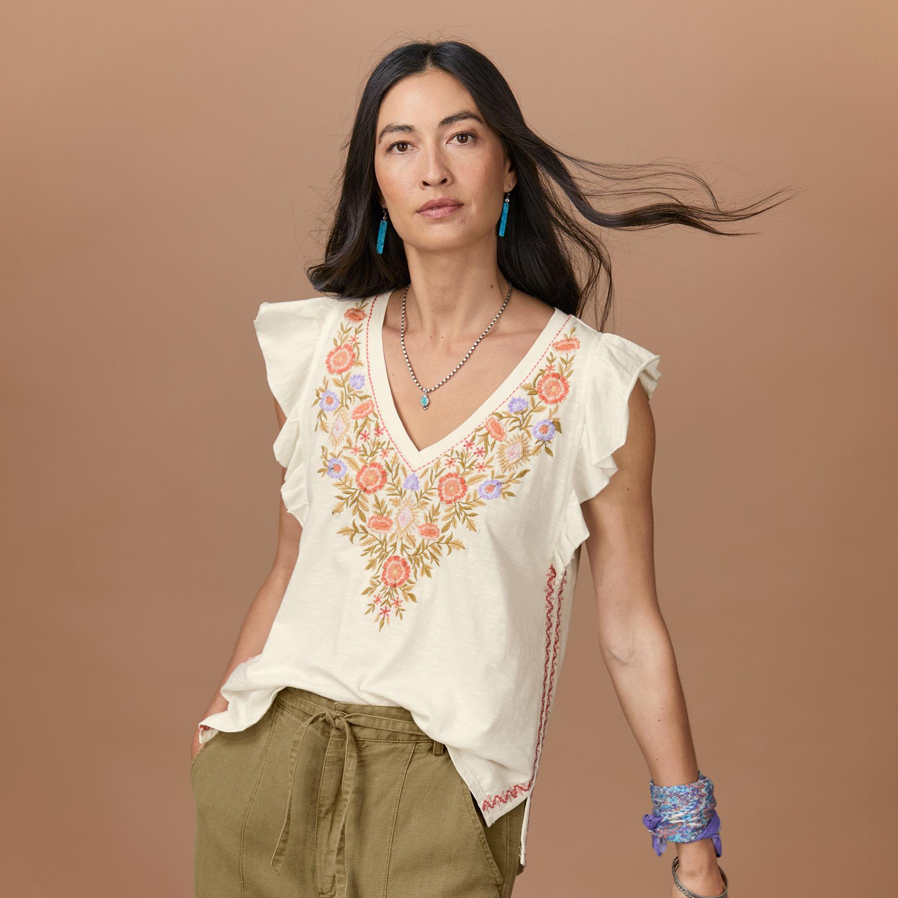 Slip into our easy-fit top with lush. floral embroidered border at V-neck. flowing flounce sleeves with raw-edge ruffle. geometric embroidery at side seams and side slits for comfort. Cotton. Machine wash. Imported. Exclusive. Sizes XXS (00). XS (0-2). S (4-6). M (8-10). L (12-14). XL (16-18). Approx. 23.5l.