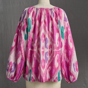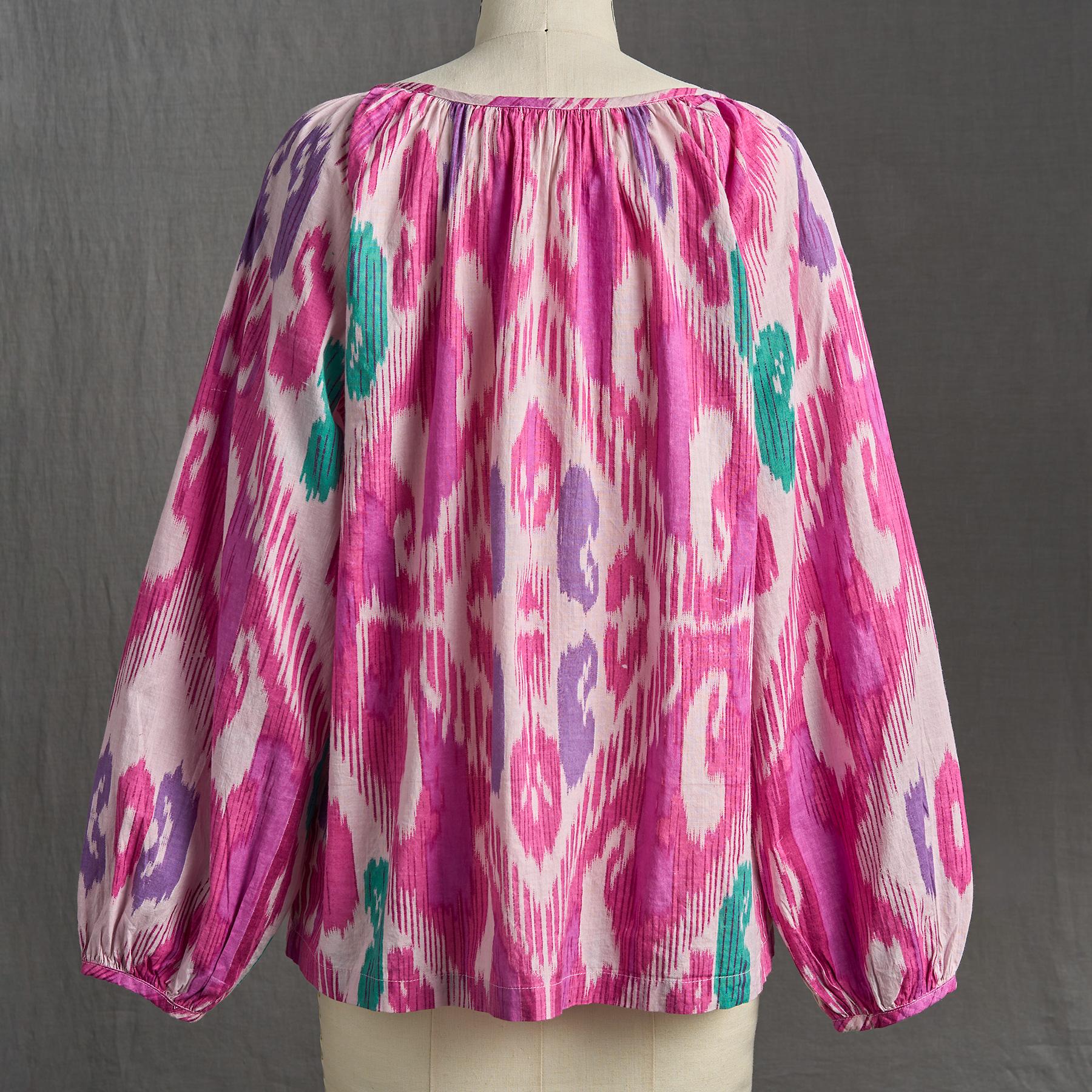 A vibrant ikat print makes a beautiful statement on this airy top with notch neckline. bracelet-length blouson sleeves and straight hem. Shirring at neckline and cuffs. Cotton. Machine wash. Imported. Sizes XS (4). S (6). M (8–10). L (12). XL (14). XXL (16). Approx. 25l.