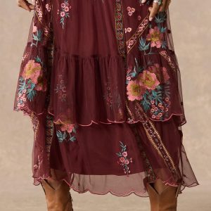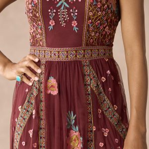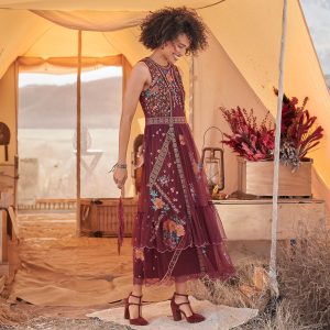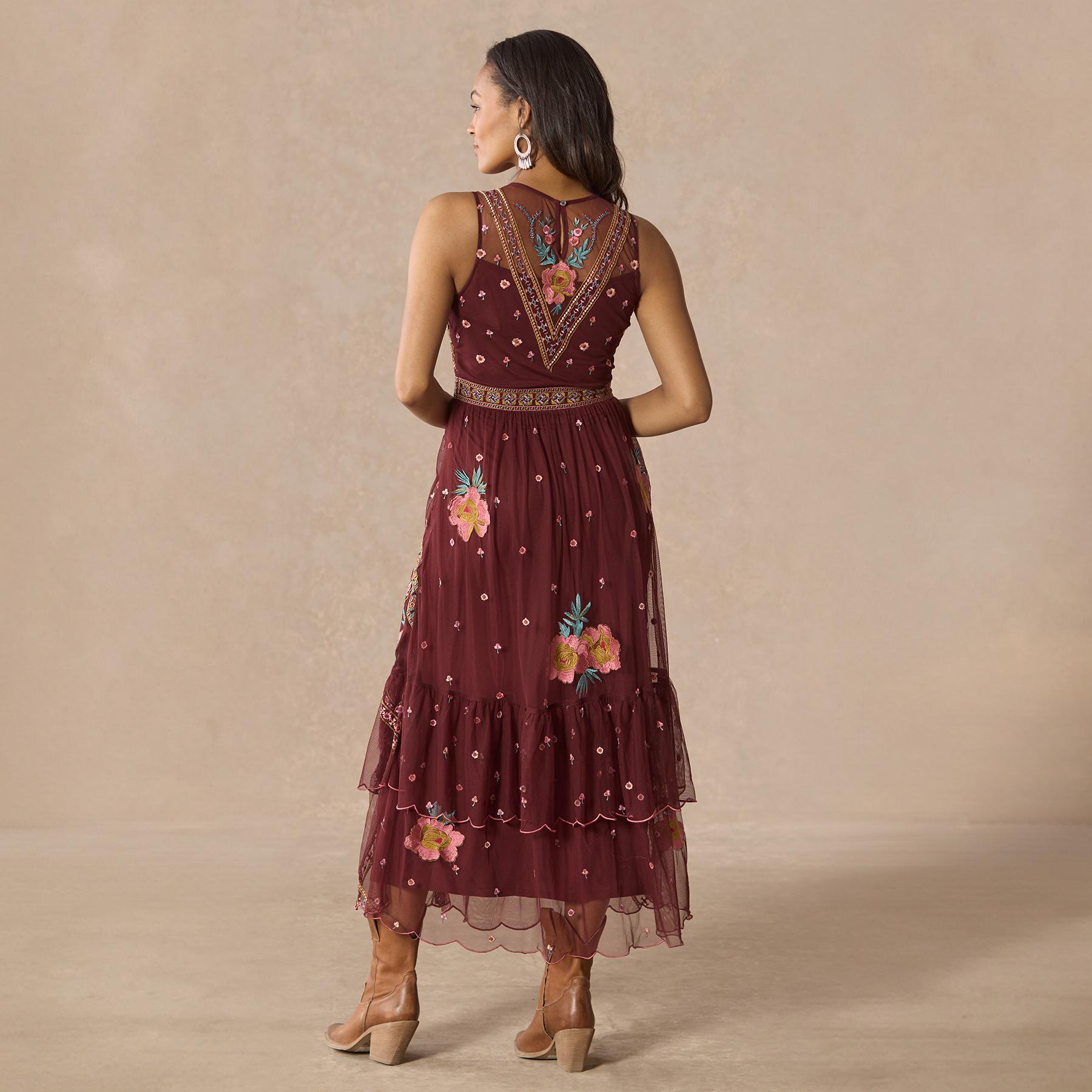 Our lovely fit and flare embroidered mesh dress features pretty florals mixed with geometric embroidery and a beautiful jewel neckline. Side zipper for an easy fit. Nylon. Hand wash. Imported. Exclusive. Sizes XS (0??). S (4??). M (8??0). L (12??4). XL (16??8). XXL (20??2). Approx. 54l.